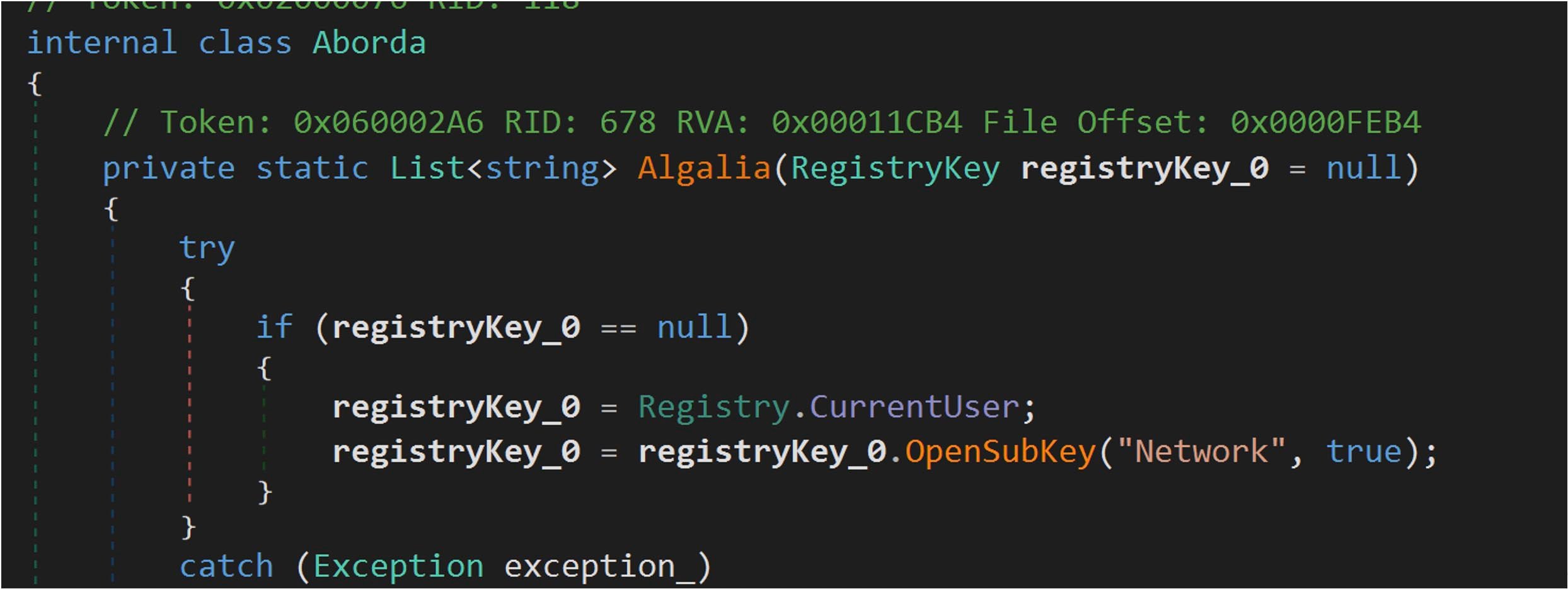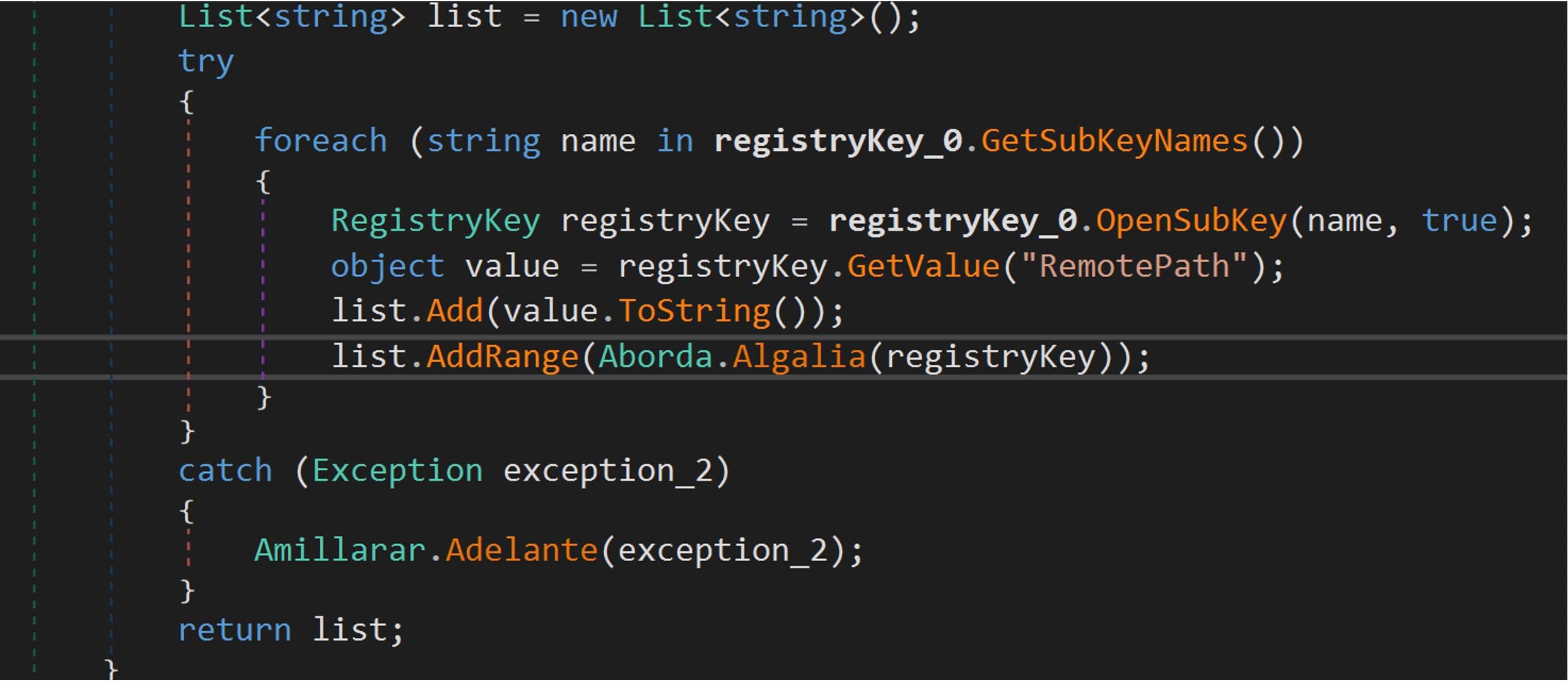 Figure 1 – Querying of the Network registry key HKEY_CURRENT_USER\Network\*\RemotePath, which stores the UNC paths of mounted shares.