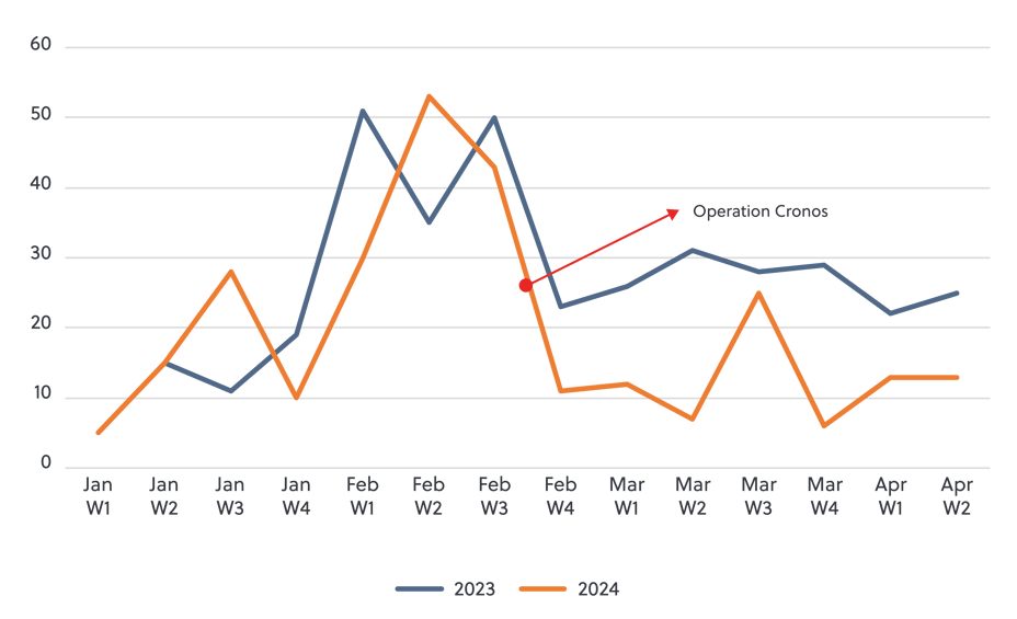 To date the operation appears to be a success. A comparison of LockBit’s publicly reported victims for the first 12 weeks of 2023 and 2024 shows a decline in overall activity (see figure 1 below). Though the group was able to restore enough infrastructure to continue operating, and is attempting to develop the next iteration of the ransomware variant, it is likely that activity surrounding the strain will continue to taper off as affiliates abandon it for other alternatives.