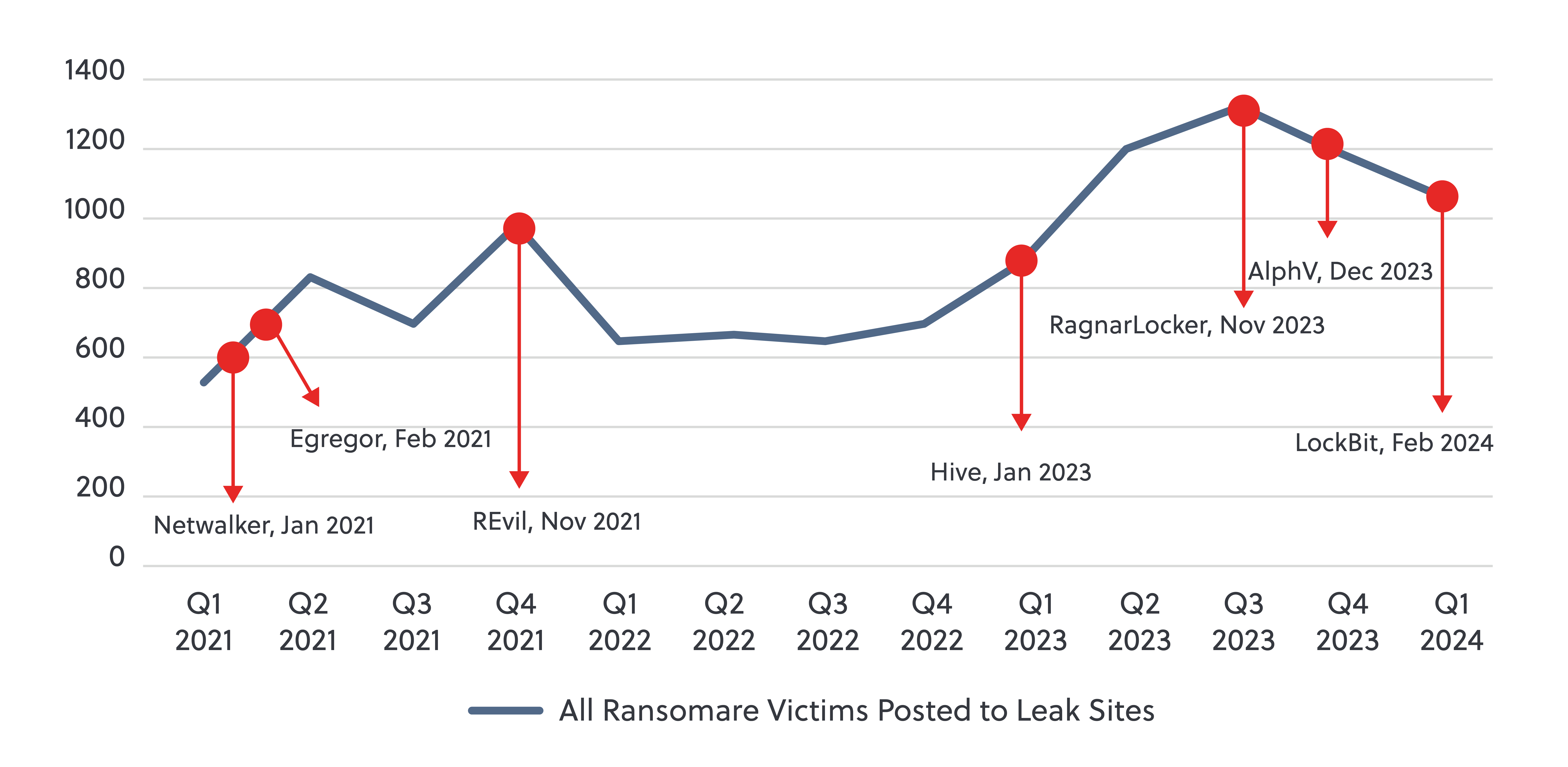 Operations targeting Netwalker (Jan 2021) and Egregor (February 2021) ransomware could have been responsible for a dip in activity between Q2 and Q3 of 2021. However, any impact was only temporary, as activity reached an all-time high of 984 new victims on leak sites in Q4 2021.