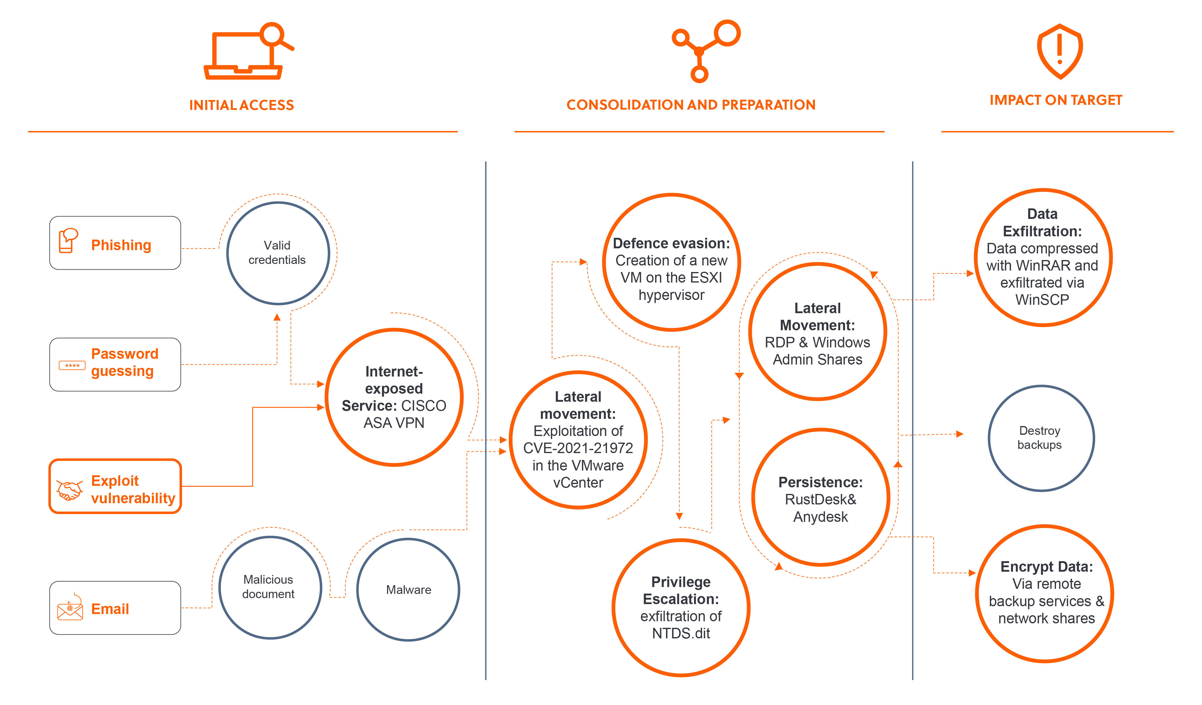 To circumvent the VMDK file's protections, Akira first temporarily powered down the domain controller's virtual machine. Then, they copied the associated VMDK files to a separate directory and affixed these copied virtual hard drives to the newly created VM. By doing so, they were able to copy the NTDS.dit file and compress it using 7-zip. Additionally, the threat actor was able to exfiltrate the SYSTEM hive, providing them with the decryption key for the password hashes. Attackers would have then been able to crack the hashes or utilise ‘pass-the-hash' methods for user authentication. By taking these novel series of steps to extract the NTDS.dit file, Akira was able to compromise a highly privileged domain administrator's account. Armed with these credentials, Akira navigated swiftly across the network, compromising additional user accounts, exfiltrating data and deploying the ransomware — all in under 6 hours. See below for the attack chain: