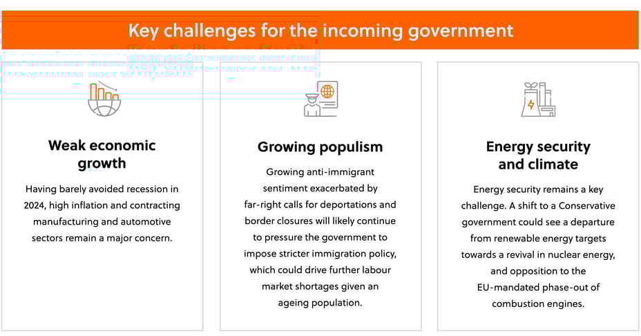 With polls showing declining public support for both Labour and Conservatives, Starmer faces the possibility of political fragmentation in the coming years, particularly if major campaign promises are unfulfilled. Already, the right-wing Reform UK party has seen support increase after Starmer’s November 2024 'Plans for Change' speech, which had intended – but largely failed – to improve confidence in the government’s agenda. In a trend largely reflective of the recent elections in which Conservatives lost much of their base to Reform, populism will continue to shape public discourse around key issues like fiscal policy, immigration, and climate goals. This will put pressure on Labour to adjust policies to retain support, and potentially contribute to existing perceptions that the party is already reneging on campaign promises. Despite Labour’s parliamentary majority, the need for a careful balancing act to appease voters while securing economic growth and stable governance is a tall order, and there are signs that these dynamics could bring more turbulence to the UK’s political landscape in the coming year than voters and investors had hoped.