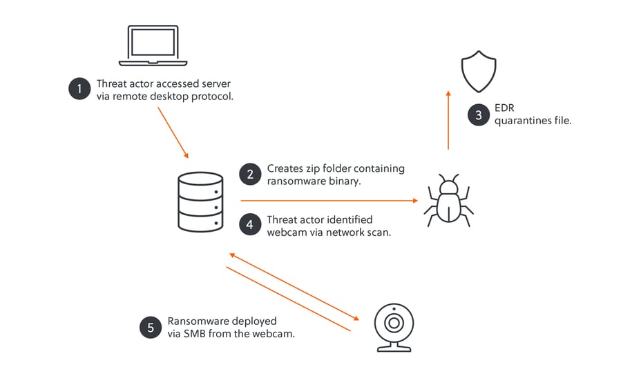 After identifying the webcam as a suitable target, the threat actor began deploying their Linux-based ransomware with little delay. As the device was not being monitored, the victim organisation's security team were unaware of the increase in malicious Server Message Block (SMB) traffic from the webcam to the impacted server, which otherwise may have alerted them.[1] Akira was subsequently able to encrypt files across the victim’s network.[2]