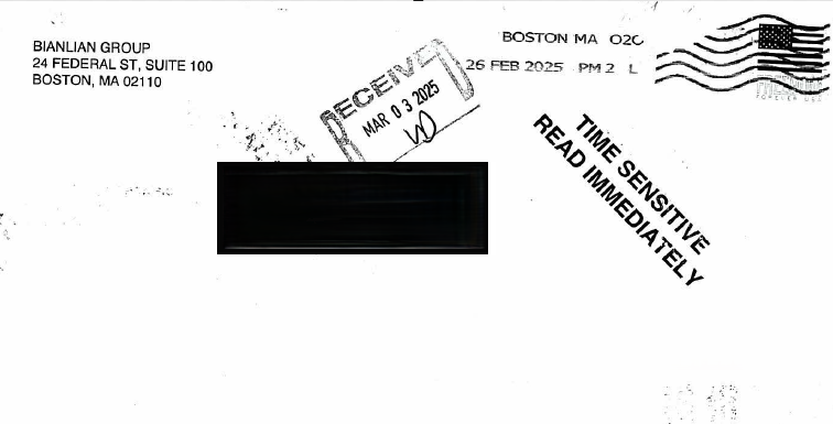 Reports indicate that hundreds of executives across the United States have received physical letters alleging network compromise and data theft. These letters, post-marked in late-February, featured a stamp reading “TIME SENSITIVE – READ IMMEDIATELY” and listed a return mail address in Boston, Massachusetts.