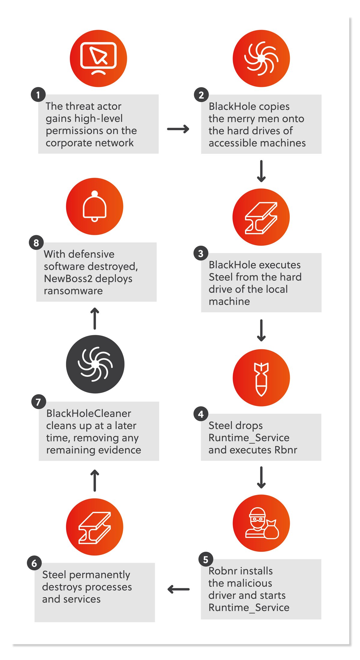 But, beyond that, I also analysed the attack method this threat group uses to spread their ransomware inside a victim’s network and identified several tools that they had developed to accomplish this. These tools work together to get rid of the defensive software that might be present in their victim’s environment. The infographic below summarises my findings in this regard: