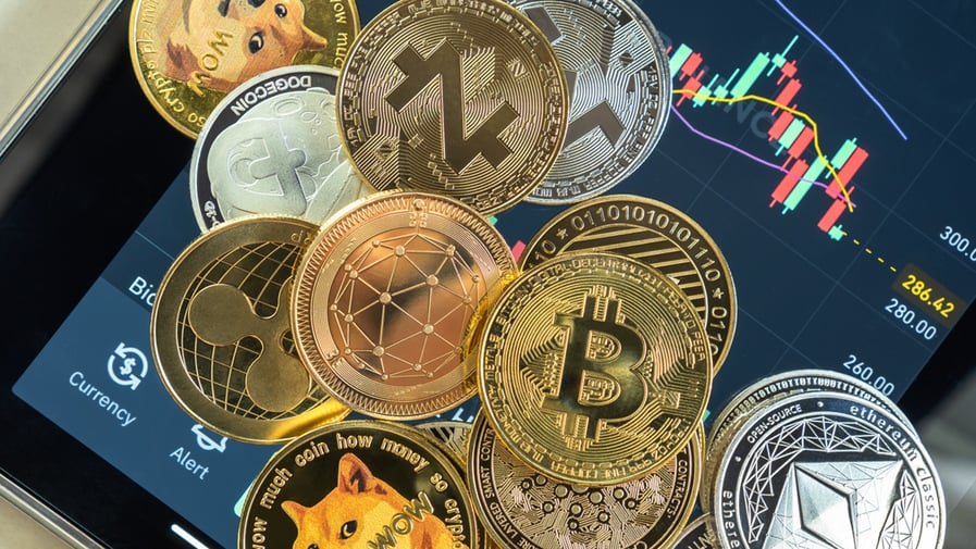 Cryptocurrency on Binance trading app, Bitcoin BTC with altcoin digital coin crypto currency, BNB, Ethereum, Dogecoin, Cardano, defi p2p decentralized fintech market