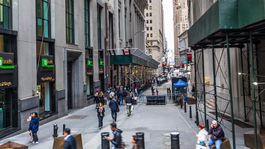 People can be seen on both sides of Wall Street. On the left, the TD Bank.