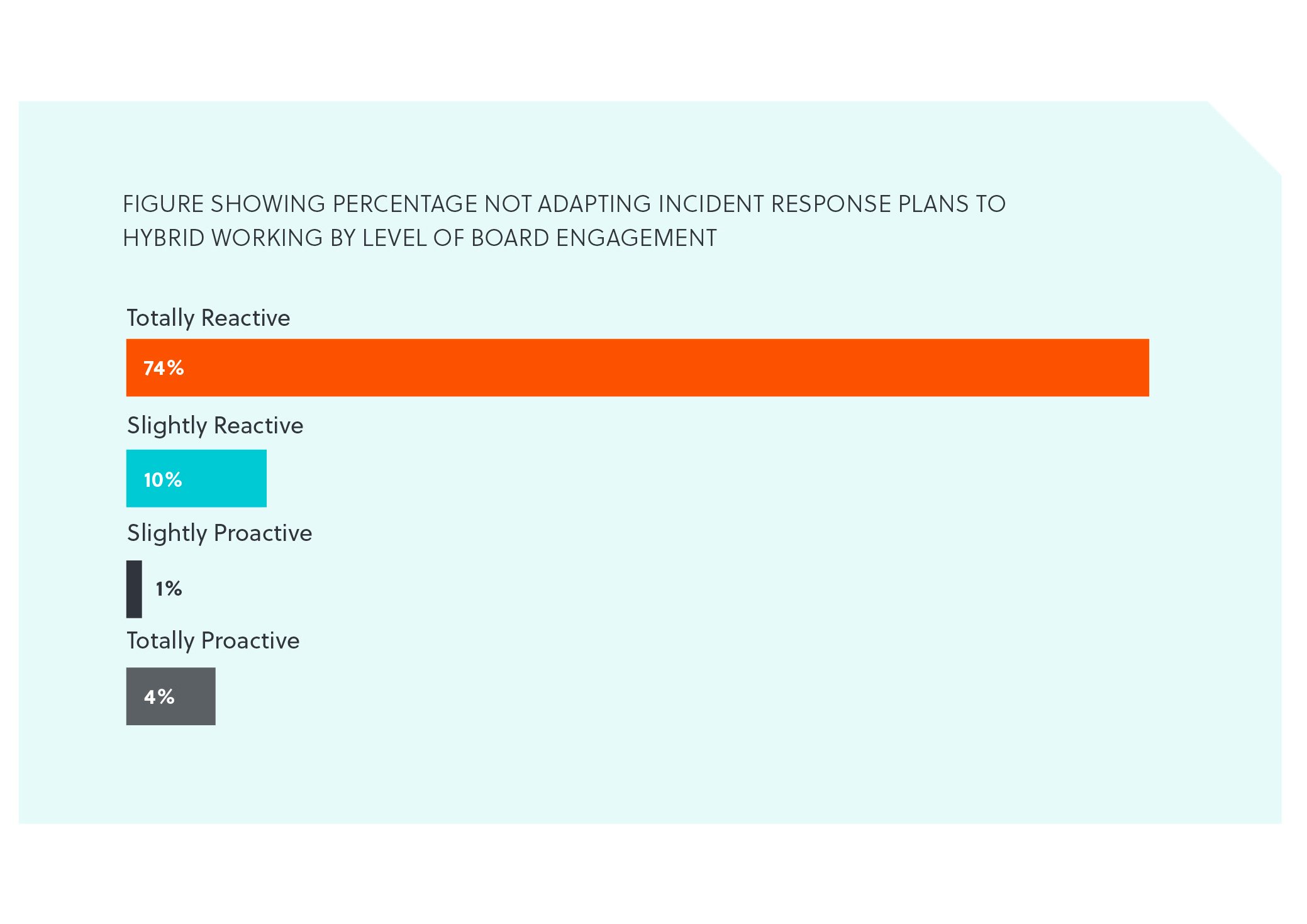 The fact that 95% of respondents to our survey (carried out for the report Investing in Cyber Resilience: Spend, Strategy and the Search for Value) pivoted their cyber incident response plans, either in part or completely to reflect hybrid working models, shows a broad appreciation of the changed threat landscape. Those that did not adapt can perhaps look to their board engagement to see why. Those organisations citing their boards as largely reactive have lagged behind their peers – with 74% stating that they have not made any changes to their response plans to date.