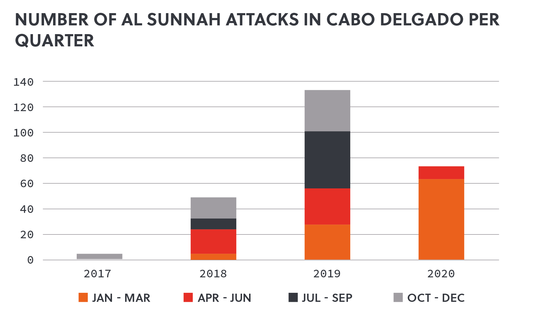 Since October 2017, Cabo Delgado has seen multiple kidnappings and attacks on villagers by the Islamist militant group. Al Sunnah have launched a series of attacks in the province, killing more than 400 people since 2017 and displacing an estimated 115,000 others. The number of attacks has increased dramatically each year. By some counts, five attacks took place in 2017, 49 in 2018, and 169 in 2019. Al Sunnah’s methods of attack have varied from burning villages and killing civilians, to sporadic attacks on vehicles traveling on isolated roads and, more recently, coordinated multistage attacks on large towns and security forces.